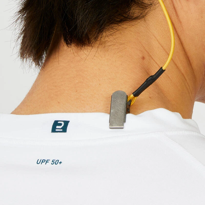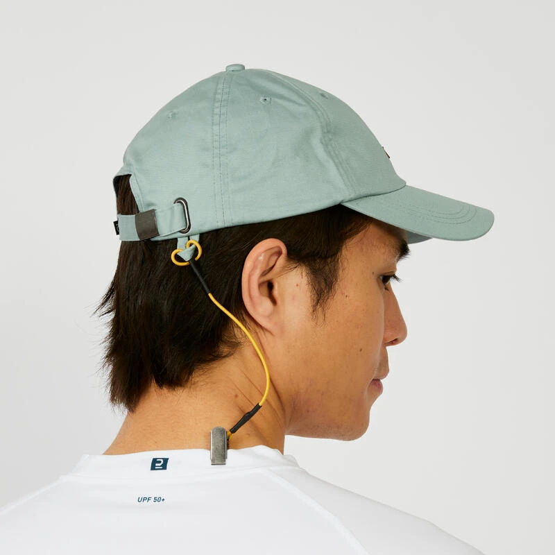 Un cordon Ă©lastique permet d’attacher la caquette Ă son t-shirt pour Ă©viter de la perdre s’il y a un coup de vent. Ce cordon est amovible