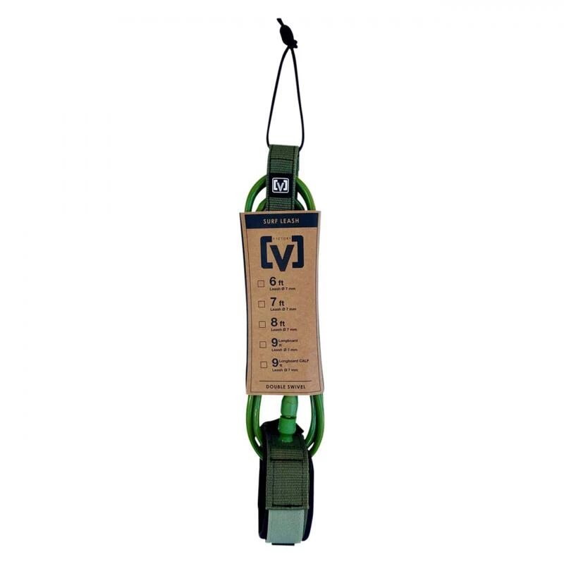 VICTORY – Surf Leash Regular 8′ – Mat Green • Urethane 7mm haute qualitĂ© • Nouveau stainless steel ‘swivels’ (emerillons) aux 2 extremitĂ©s • Rail saver dĂ©tachable avec poche Ă clĂ©. • Ficelle Custom